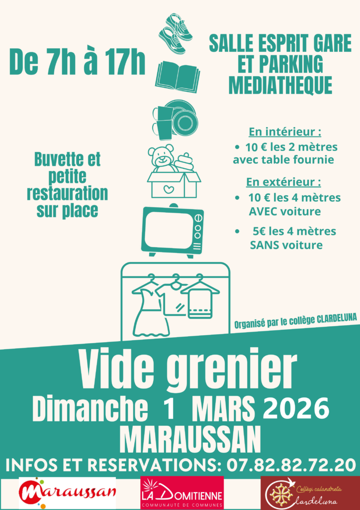 Grand vide-grenier du collège Clardeluna le dimanche 1er mars 2026 à Maraussan.