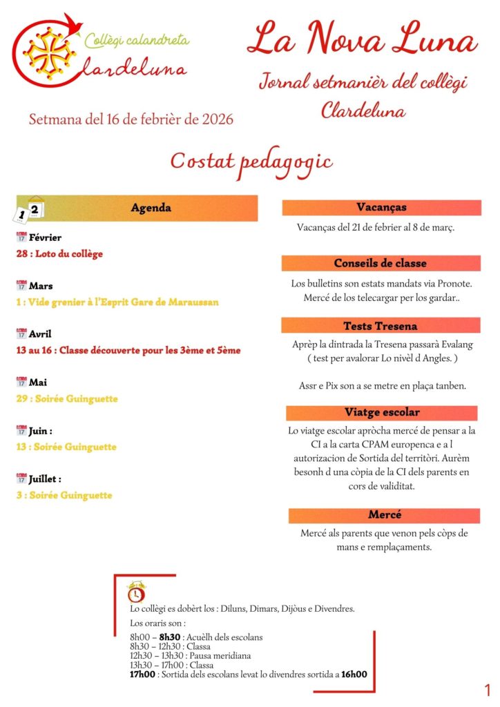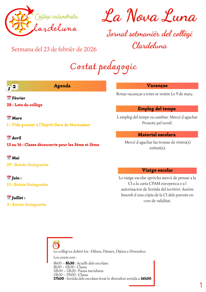 Le Collège Clardeluna à Maraussan a vu le jour en septembre 2017 grâce à une commission de parents de calandrons à l’initiative de ce projet et qui ont réalisé toutes les démarches afin de proposer une solution pédagogique logique dans la continuité de l’enseignement proposé au sein des écoles calandretas.
